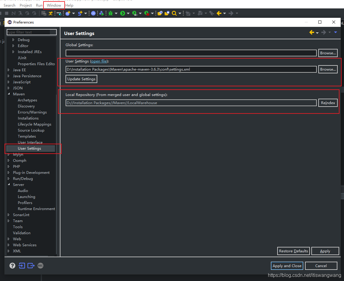 4. window-preferences-maven-User Settings,检查user setting和local repository路径是否正确