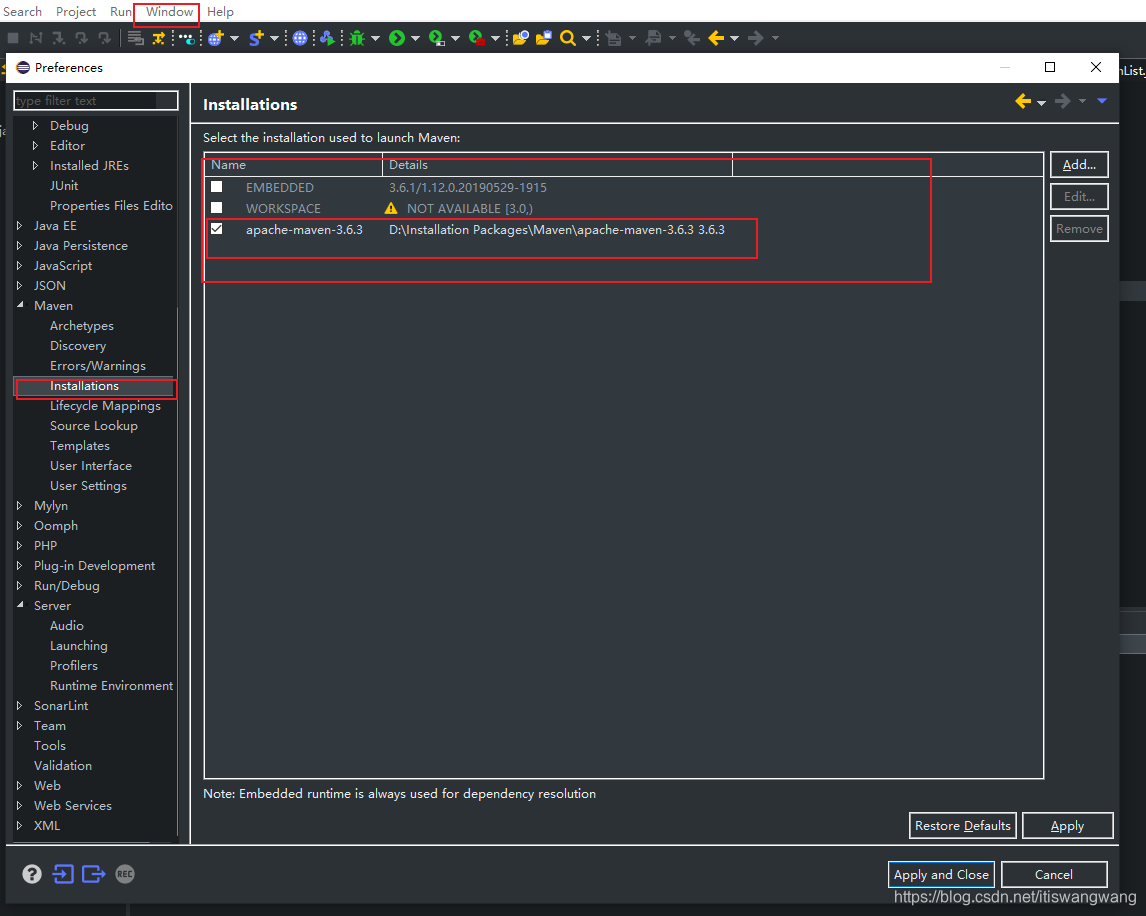 3. window-preferences-maven-installations,检查对应版本maven是否添加,并勾选