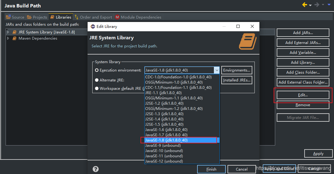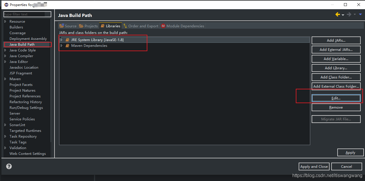 3.项目根目录右键-properties-Java Build Path,检查libraries中是否添加jre system library和maven dependencies,并确定jre system library的版本。