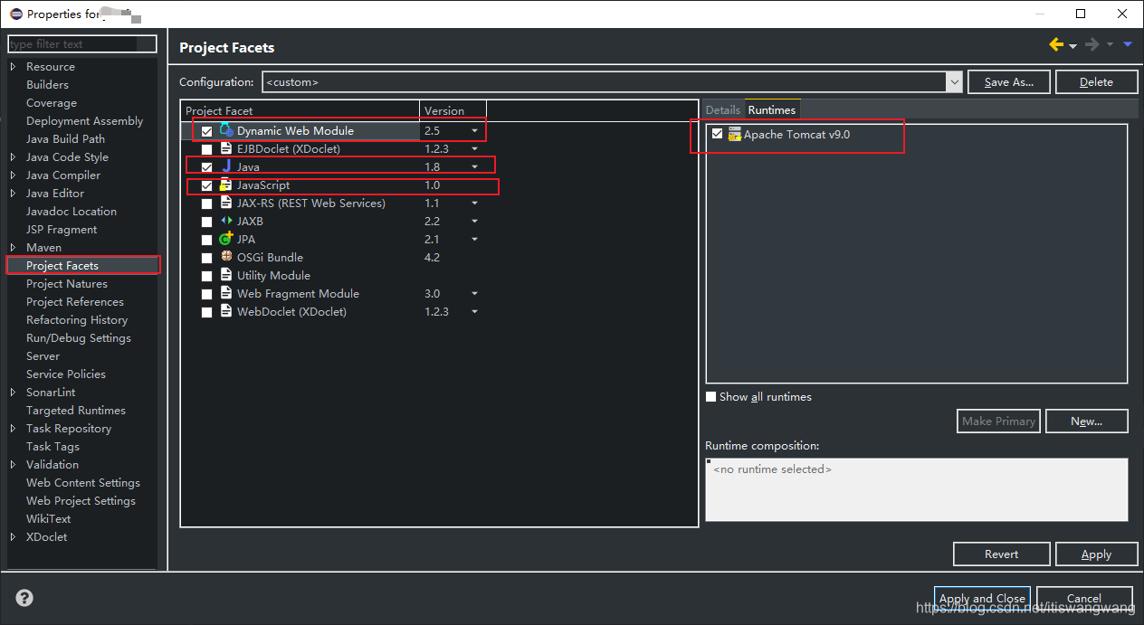 5. 项目根目录右键-properties-Maven-Project Facets,检查maven中project facets配置项及对应版本,Dynamic Web Module(一般为2.5),Java(选择对应版本),JavaScript(一般为1.0);检查右侧Runtimes中是否勾选对应版本tomcat,