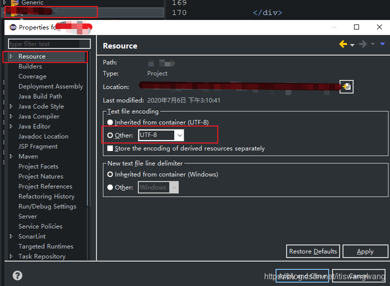 1. 项目根目录右键-properties-resource,检查编码方式,选择utf-8,