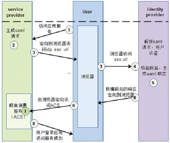 通过SAML实现单点登录的运转过程如图:
