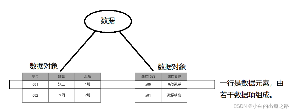 - 数据元素:是组成数据的、有一定意义的基本单位,在计算机中通常作为整体处理,也被称为节点或记录。