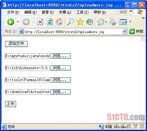 在execute方法中,只是对list对象进行枚举,在循环中的代码和上传单个文件时的代码基本相同。如果读者使用过struts1.x的上传组 件,是不是感觉struts2的上传功能更容易实现呢?在struts1.x中上传多个文件时,可是需要建立带索引的属性的。而在struts2中,就是 这么简单就搞定了。图1是上传任意多个文件的界面。