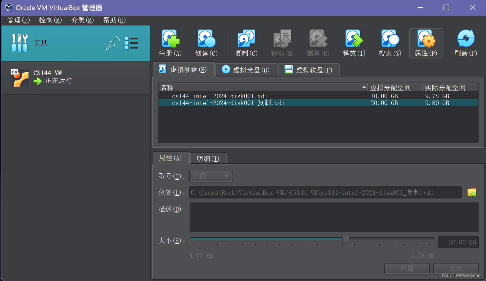 网上有人说可以先复制一份,在复制过程中调整硬盘大小,经过实测表明无效,比如在复制时把10GB调整为20GB,复制过后虚拟分配空间仍为10GB,所以我直接用下面的大小调整修改硬盘容量。