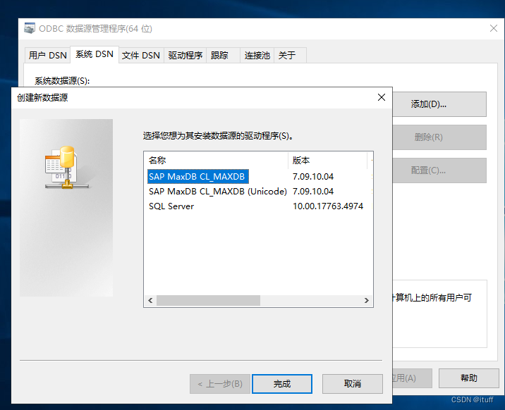 7、在“系统DSN”里点击“添加”,选择“SAP MaxDB CL_MAXDB(Unicode)”(如果数据库中有中国字段),点击“完成”: