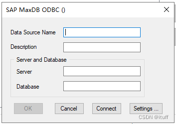 8、输入自定义的“Data Source Name”,在“Server and Database”输入MaxDB IP地址和数据库名,点击“Connect“输入用户名和密码可以测试ODBC是否连接成功。