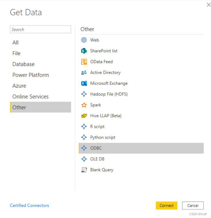 10、选择“Other”-“ODBC”,点击“Connect”: