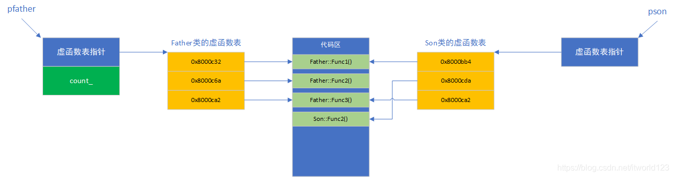 func2_son = (FUNC) * (vptr_son + 1); // 得到虚函数 Son::Func2() 的地址。