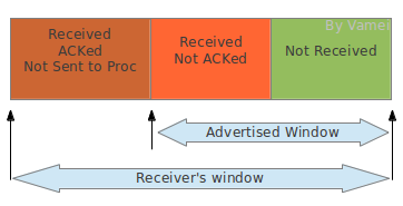 可以看到,接收方的滑窗相对于发送方的滑窗多了一个 " Received ACKed Not Sent to Proc " 的部分。接收方接收到的文本流必须等待进程来读取。如果进程正忙于做别的事情,那么这些文本流即使已经正确接收,还是需要暂时占用接收缓存。