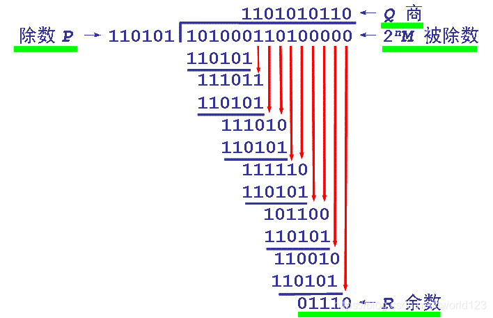 1、在 1010001101 后面添加 5 个 0,因为除数为 6 位,所以余数为 5位,最后将余数添加到 1010001101 后面得到结果 101000110101110。