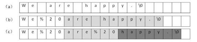 从开始位置向后遍历,如果发现空格,则挪动后面的字符串腾出 2 个字符的空间,写入“%20”,直至到字符串末尾。