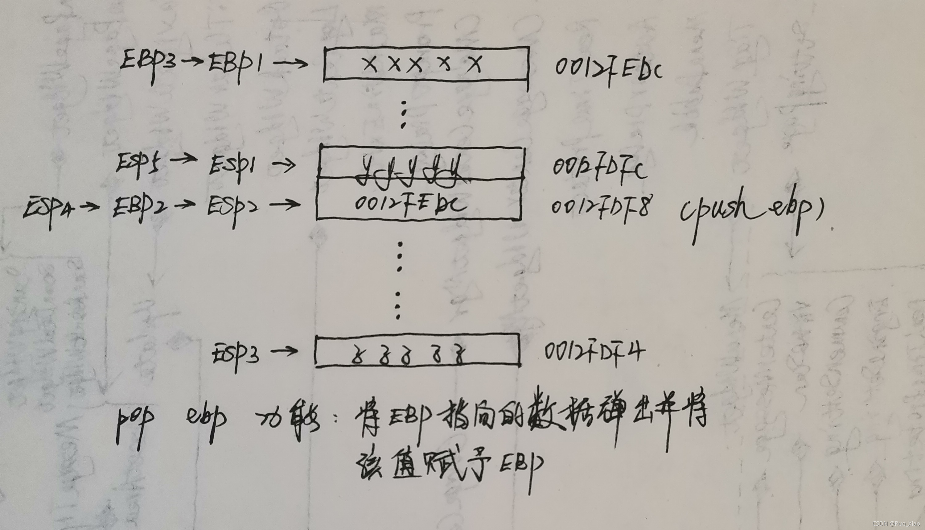 此时 ebp 已经出栈了,来看看那他们的值,esp = 0012FDFC,ebp = 0012FEDC。首先,ebp 出栈了,这个时候栈空了,所以栈顶会变成初始时的值 0012FDFC。相当于上图中的 esp = 0012FDF8 + 4 = 0012FDFC。注意出栈,则栈顶 + 4,然后呢。ebp 为啥变成了 0012FEDC 初始的值?ebp 不是一直保存着 esp 的初始地址么?