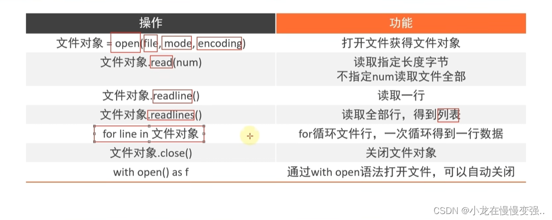 注意:此时的f是open函数的文件对象,对象是python中一种特殊的数据类型,拥有属性和方法,可以使用对象。属性或对象。方法对其进行访问