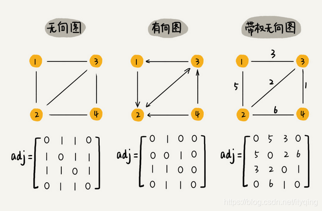 邻接矩阵的底层依赖一个二维数组。对于无向图来说,如果顶点 i 与顶点 j 之间有边,我们就将 A[i][j] 和 A[j][i] 标记为 1;对于有向图来说,如果顶点 i 到顶点 j 之间,有一条箭头从顶点 i 指向顶点 j 的边,那我们就将 A[i][j] 标记为 1。同理,如果有一条箭头从顶点 j 指向顶点 i 的边,我们就将 A[j][i] 标记为 1。对于带权图,数组中就存储相应的权重。