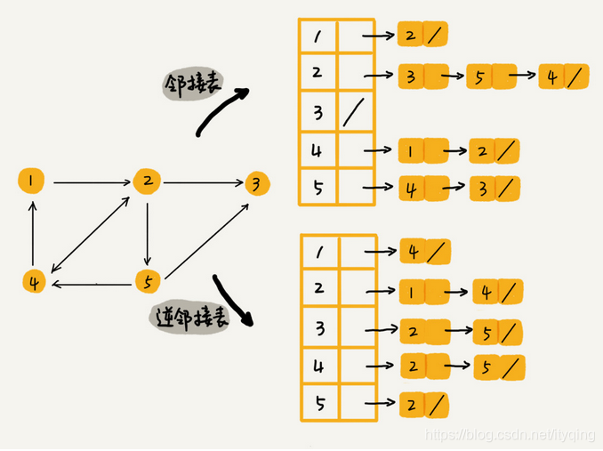 每个顶点对应一条链表,链表中存储的是与这个顶点相连接的其他顶点。