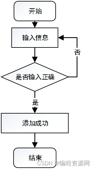 然后是添加信息的页面。进入该页面后,页面会出现一个提示框,示意操作者可以进行信息的添加,从而进行下一步的操作。用户输入想要添加的信息后提交,系统会对输入的内容进行检测。如果检测后输入的信息正确,则会出现“添加成功”的提示框,从而可以进行下一步操作;如果系统检测后检测到想要添加的信息不符合规范要求,则会提示报错,需要进行修改后重新添加。添加信息流程图如图3-4所示: