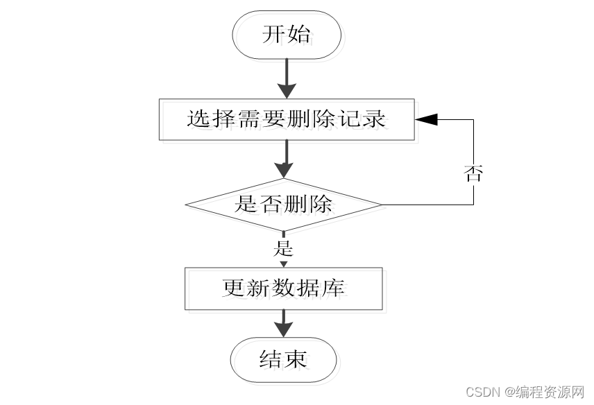 最后为删除信息页面。进入该页面后,用户可以对所要删除的信息进行选择,选择好删除的内容后,会有一个“是否确认删除”的提示框,操作者可以根据自己的意愿来选择“是”或“否”。完成上述操作,系统会自动地对删除的内容进行判断,如果符合删除要求则会成功删除数据记录,并且更新数据库的内容信息;如果删除的数据记录不符合要求,则会有一个“删除失败”的提示框,操作人员需要根据提示来进行修改,修改完成后重新删除知道删除成功。删除信息流程图如图3-5所示: