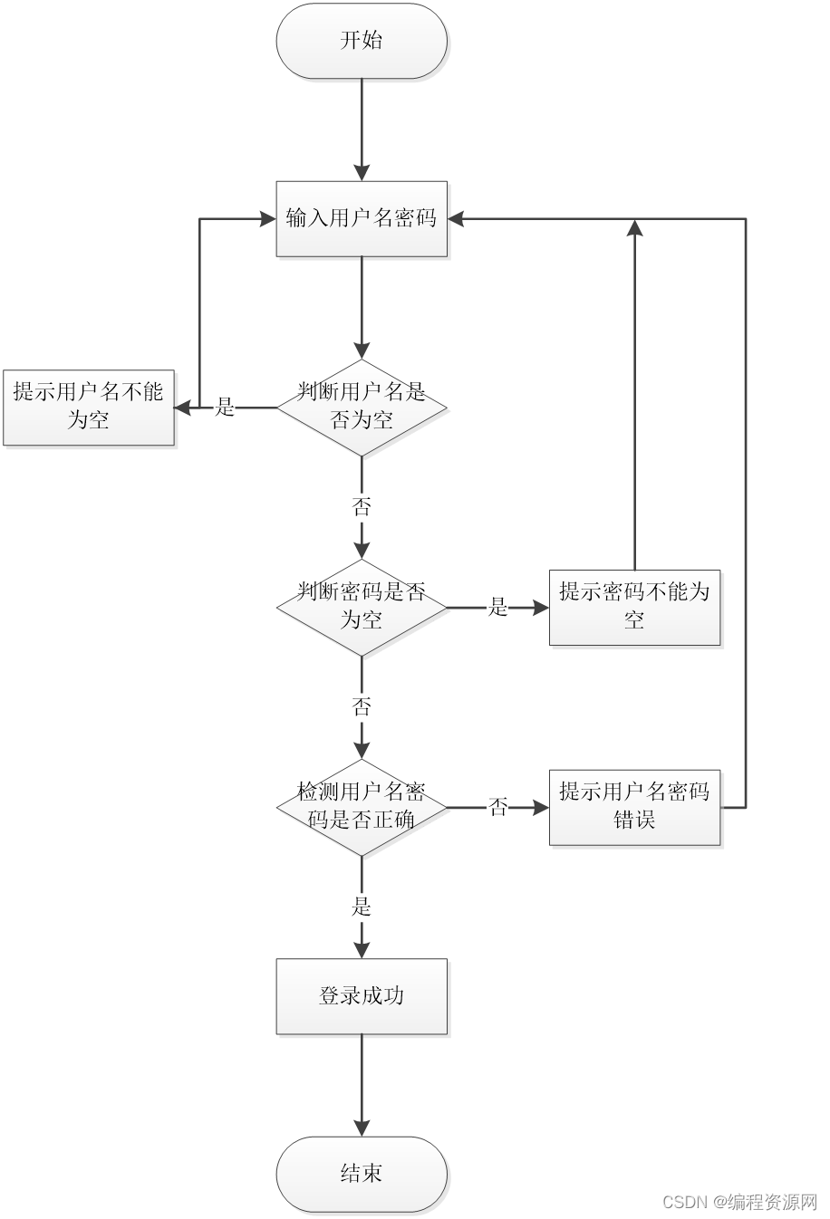 首先为系统登录页面。进入页面后,用户可进行登录和注册的操作。点击登录后,页面就会出现一个登录提示框,向用户传达信息:要进行用户名和密码的输入,完成后才可以进行下一步的操作。用户输入完成后,系统会将输入的信息提交给后台,与数据库中的信息记录进行比较判断。判断比较内容主要分为三个方面:从用户名是否为空、输入的密码是否为空、用户名和密码是否匹配三方面进行判断。只有上述三个条件同时满足,数据库中的信息匹配正确,才视为登录成功,方可完成后续的操作。若以上三种情况有一条不满足,则会提示该次登录错误,就需要进行重新登录。系统登录流程图如图3-3所示: