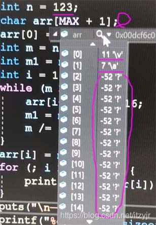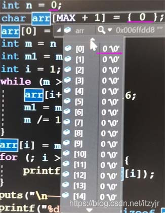 函数itobs()中主要涉及位操作符&和>>。对01 & n求值。 01是一个八进制形式的掩码, 该掩码除0号位是1之外, 其他所有位都为0。 因此, 01 & n就是n最后一位的值。 该值为0或1。 但是对数组而言, 需要的是字符'0'或字符'1'。该值(0~9)加上'0'即可完成这种转换(参考:关于ASCII码与转义字符)。 其结果存放在数组中倒数第2个元素中(最后一个元素用来存放空字符)。