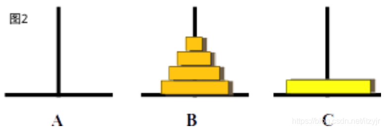 步骤3:此时移动完如(图1),但是还没有移动结束,这时要将a柱子上的最后一个(第n个)盘子直接移动到c(图2)。
