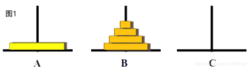 有三根杆子A,B,C。A杆上有N个(N>1)穿孔圆盘,盘的尺寸由下到上依次变小。要求按下列规则将所有圆盘移至C杆: