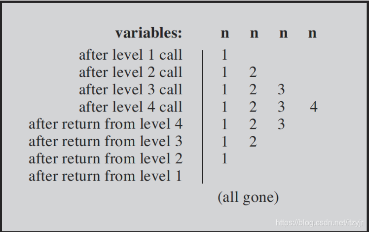 程序代码中的 main() 函数调用up_and_down()函数,这次调用称为“第1级递归”。然后up_and_down()调用自己,这次调用称为“第2级递归”。接着第2级递归调用第3级递归,以此类推。该程序示例共有4级递归。
