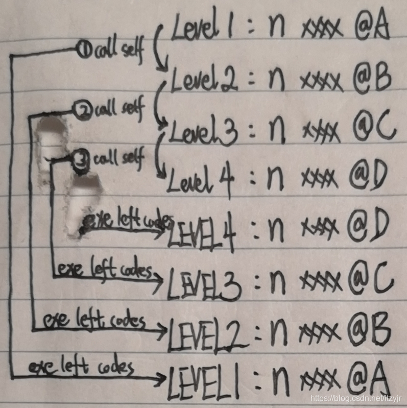 通过变量n的地址,我们也可以清晰的知道,同一级的n是没变的,说明靠前级是等待后面级执行完毕后再接着执行自己。只是由于递归,导致靠前级无法直接执行完剩余的语句,递归调用自己函数本身就让程序又回到了函数的第一条语句。但最后一级的语句执行完后,靠前一级的就继续接着执行剩余的语句了,这样一级级执行下去直至程序结束。