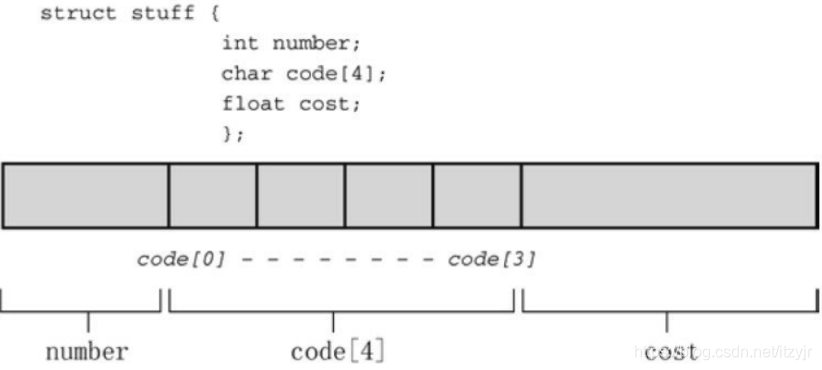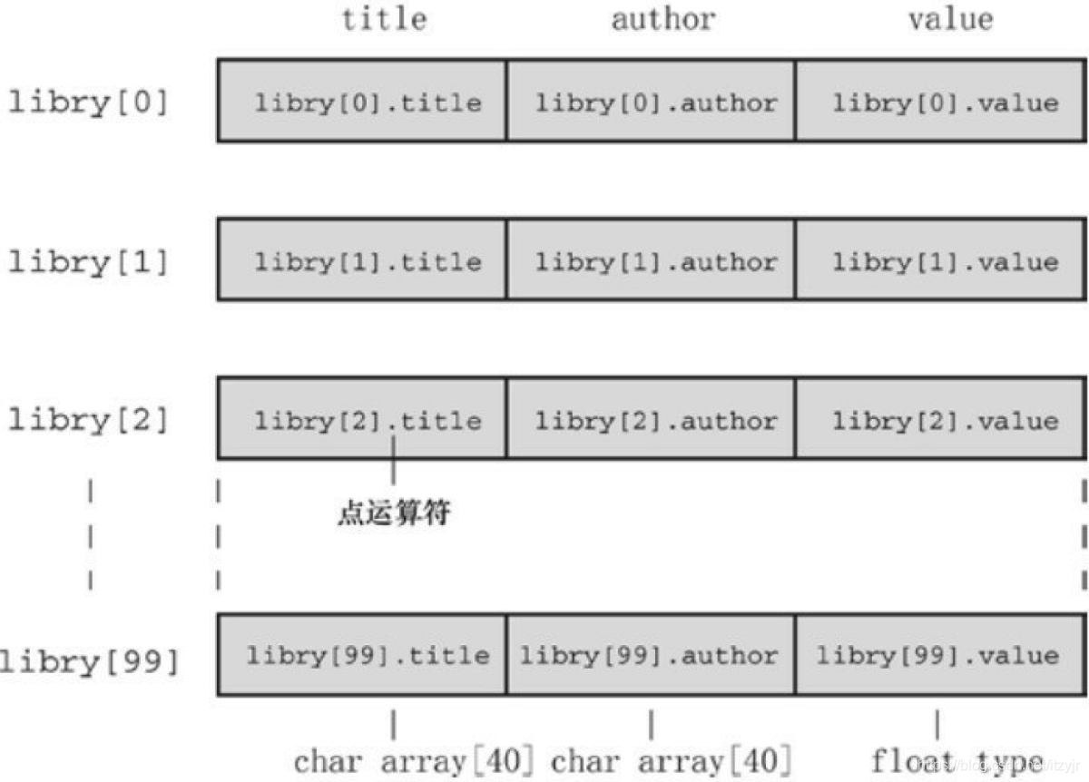 编译器执行这行代码便创建了一个结构变量library。编译器使用book模板为该变量分配空间:一个内含MAXTITL个元素的char数组、一个内含MAXAUTL个元素的char数组和一个float类型的变量。这些存储空间都与一个名称library结合在一起。