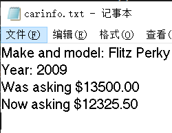 该程序运行之前,文件carinfo.txt并不存在。在这种情况下,方法open( )将新建一个名为carinfo.txt的文件。如果在此运行该程序,文件carinfo.txt将存在,此时情况将如何呢?默认情况下,open()将首先截断该文件,即将其长度截短到零——丢其原有的内容,然后将新的输出加入到该文件中。