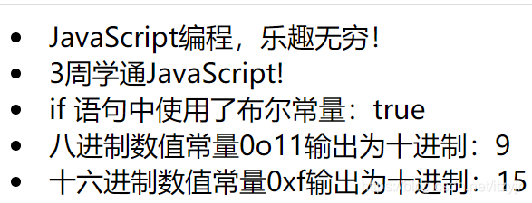 document.write("<li>JavaScript编程,乐趣无穷!<br>");