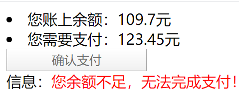document.write("信息:<font color='red'>您余额不足,无法完成支付!</font>");