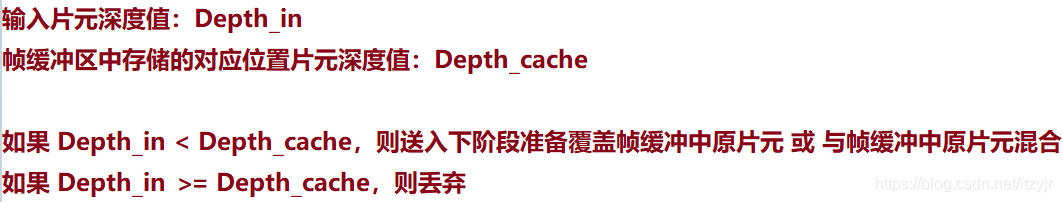 深度缓冲:用来存储每个片元的深度值——以特定的内部格式表示的从片元处到观察点(摄像机)的距离。在启用深度测试的情况下,新片元想进入帧缓冲时需要将自己的深度值与帧缓冲中对应位置片元的深度值进行比较,若结果为小于才有可能进入缓冲,否则被丢弃。