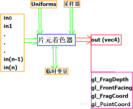 in0~in(n):从顶点着色器传递到片元着色器的变量,其由系统在顶点着色器后的光栅化阶段自动产生,其个数是不一定的,取决于具体的需要。