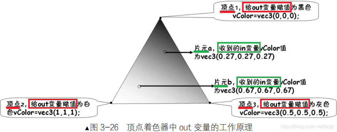 ①out限定符之前含有smooth限定符或不含任何限定符,则传递到后继片元着色器对应的in变量的值,是在光栅化阶段由管线根据片元所属图元各个顶点对应的顶点着色器对此out变量的赋值情况及片元与各顶点的位置关系插值产生。下图说明了问题。