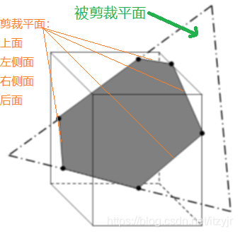 如图,给出了一个三角形图元,被4个剪裁平面剪裁后,三角形3个顶点生成了6个新的顶点。