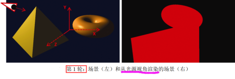 假设场景的原点位于图的中心在金字塔和环面之间(左图)。在第 1 轮中,我们将[相机]放在光源的位置并指向(0, 0, 0)。然后我们用红色绘制对象,它会产生如右图所示的输出。即,下图(右)是场景在【光源视角】下所渲染的场景。