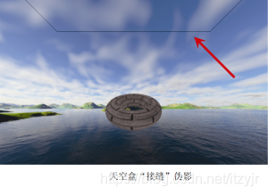 天空盒容易受到图像畸变和接缝的影响。 接缝指两个纹理图像接触的地方(比如沿着立方体的边缘)有时出现的可见线条。下图展示了一个图像上半部分出现接缝的示例,它是运行上面程序时出现的伪影。为了避免接缝,需要仔细构建立方体贴图图像,并分配精确的纹理坐标。有一些工具可以用来沿图像边缘减少接缝(例如GNU Image Manipulation Program)。