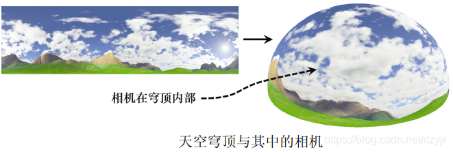 建立地平线效果的另一种方法是使用天空穹顶。除了使用带纹理的球体(或半球体)代替带纹理的立方体,其基本思路与天空盒相同。与天空盒相同,我们首先渲染天空穹顶(禁用深度测试),并将摄像机保持在天空穹顶的中心位置(下图中的天空穹顶纹理是使用Terragen这个工具制作的)。