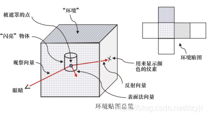 使用 OpenGL GL_TEXTURE_CUBE_MAP 实现立方体贴图,那么 OpenGL 可以使用与之前为立方体添加纹理相同的方法来进行环境贴图查找。我们使用视图向量和曲面法向量计算视图向量对应的离开对象表面的反射向量。然后可以使用反射向量直接对纹理立方体贴图图像进行采样。查找过程由 OpenGL samplerCube 辅助实现;回忆上述 samplerCube 使用视图方向向量索引。因此,反射向量非常适用于查找所需的纹素。