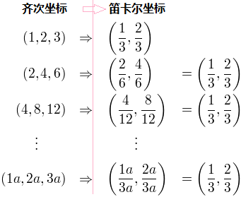 如你所见,点(1,2,3)、(2,4,6)和(4,8,12)对应于相同的欧几里德点(1/3,2/3)。任何标量积(1a,2a,3a)与欧氏空间中的(1/3,2/3)是同一点。因此,这些点是“齐次的”,因为它们代表欧几里德空间(或笛卡尔空间)中的同一点。换句话说,齐次坐标是尺度不变的。