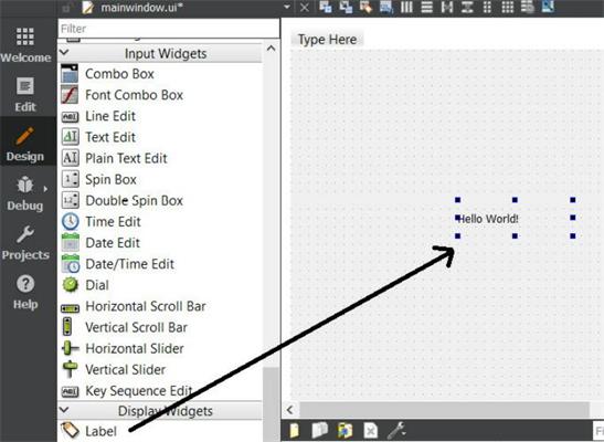 你可以找到一个后缀为“.ui”的表单文件。编辑器窗口左侧的ui扩展。在用户界面文件双击它。在这里,可以看到文件在另一个界面下打开:Qt Designer。你可以看到模式选择面板已切换到设计模式。现在,将Display Widgets类别下列出的Label控件拖动到右侧表单的中心,如下图所示。接下来,双击拖入的项目,并键入Hello World!。按键盘上的Enter键或用鼠标单击控件外的任意位置以保存文本。