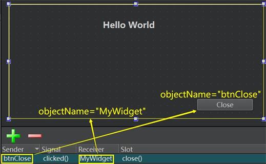 为拖入的PushButton(objectName设置为“btnClose”)增加一个功能,就是单击此按钮,关闭窗口(objectName设置为“MyWidget”)。