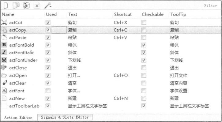 Action是一种不可见的界面元素,主要用于菜单项、工具栏按钮设计。Action的主要信号是trigger(),为一个Action的trigger()信号编写槽函数之后,菜单和工具栏上由此Action创建的菜单项和工具栏按钮就都关联此槽函数。