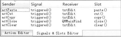 在本程序中,“剪切”“复制”“粘贴”的enabled属性应该随文本框文字选择的状态变化而变化。在主窗体上选择文本编辑框txtEdit,在快捷菜单里调用“Go to slot”对话框。对话框里列出了QTextEdit的所有信号,有两个可以利用的信号。