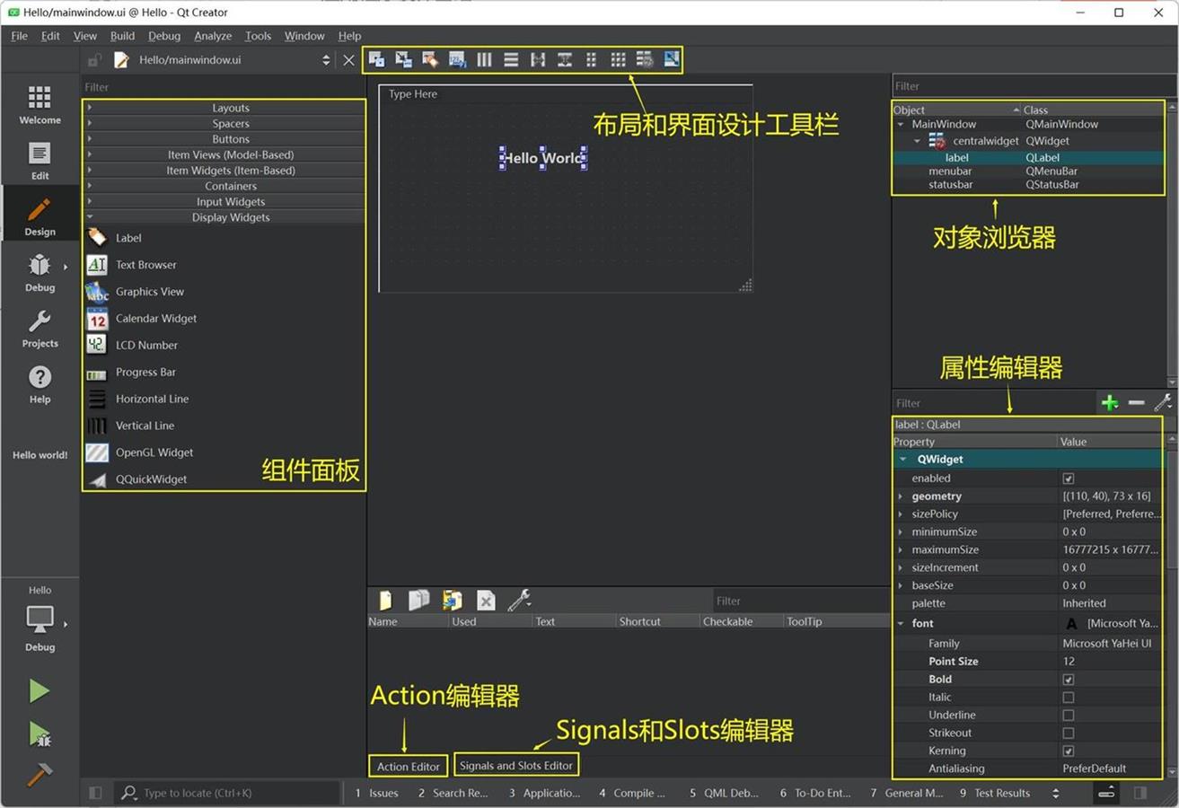 - Signals和Slots编辑器:可视化地进行信号与插槽的关联