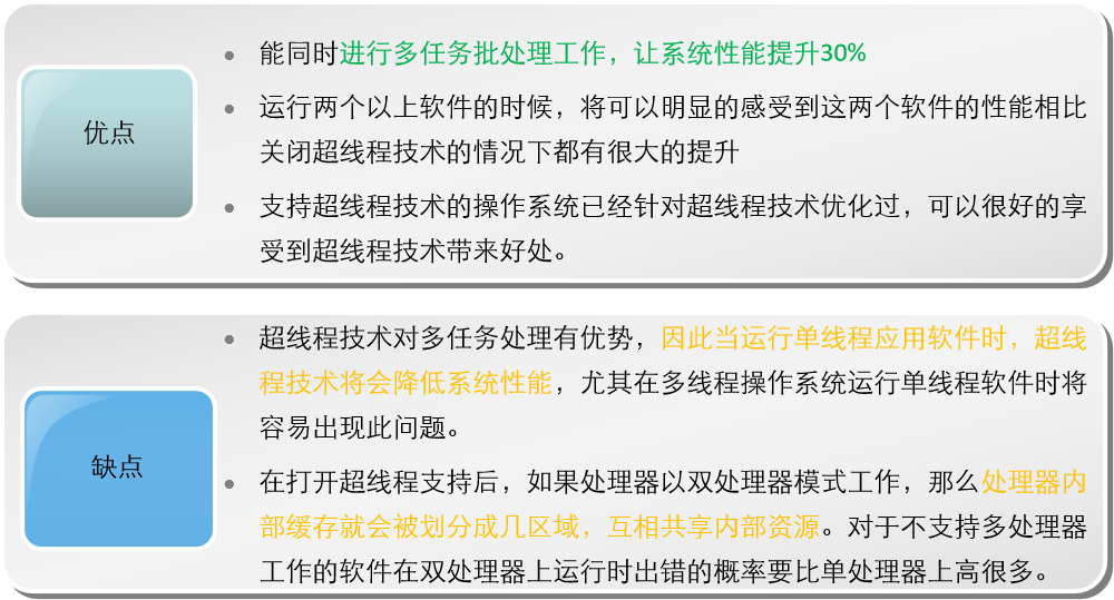 超线程技术是利用特殊的硬件指令,把两个逻辑内核模拟成两个物理芯片,让单个处理器都能使用线程级并行计算(*),进而兼容多线程操作系统和软件,减少了CPU的闲置时间,提高了CPU的运行效率(作用)。