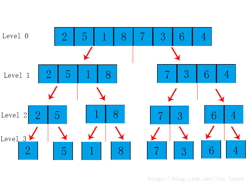 该算法是采用分治法来实现的,将原来的数组不断对半分,直到分得每个数组含有一个元素后,再一层一层归并的过程(按要求排列好)