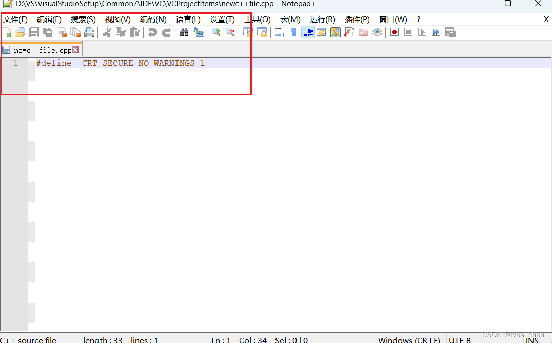 打开红框框选的文件,将内容“#define _CRT_SECURE_NO_WARNINGS 1”填写进去,然后保存