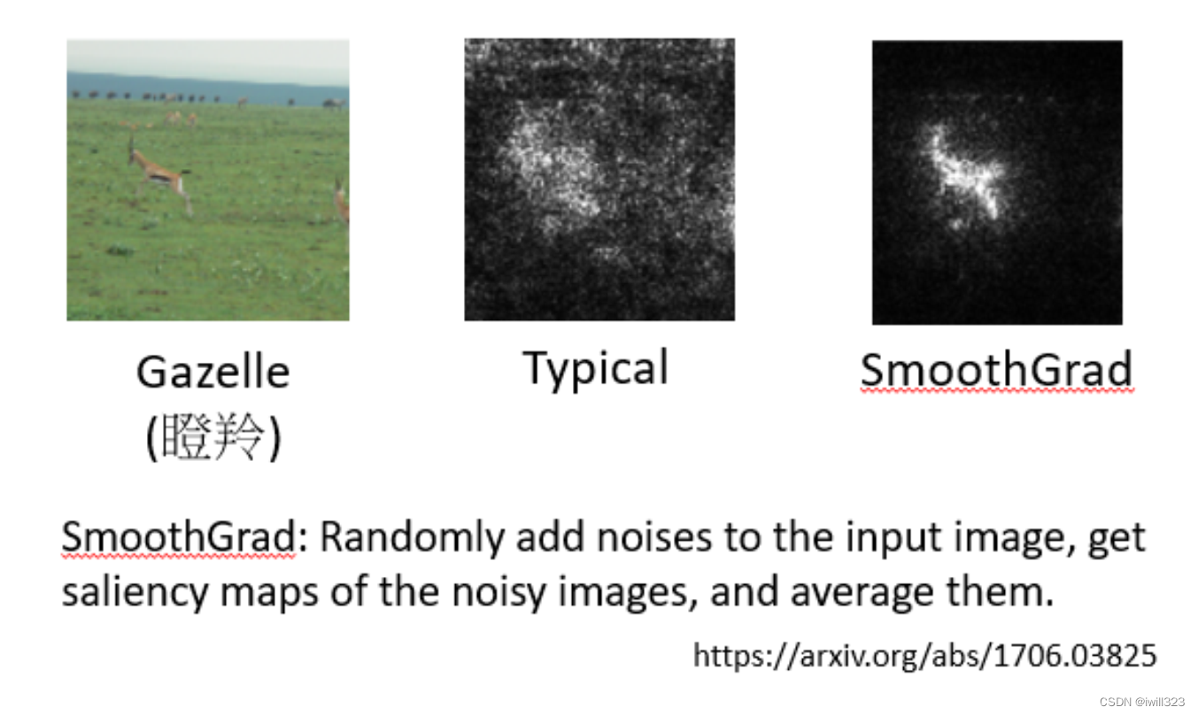 smoothGrad:给输入的图片随机加入noise得到一系列的图片,对每个图片算saliency map后作平均,得到一個比較能抵抗 noisy gradient 的結果,这样就知道哪些像素点才是真正的决策因素了。